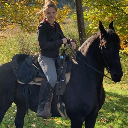 The flashiest horse in the barn, this magnificent beauty is a rare breed called a Friesian, one of the breeds that medieval knights used when riding into battle. Friesians are more muscular than our other breeds and naturally lift their legs higher when they move than other horses do. Jerusalem is extremely intelligent, picking up commands quickly and performing in both the ring and on trails. For people who know horses, she is the one that makes them stop and stare with a "Wow!"